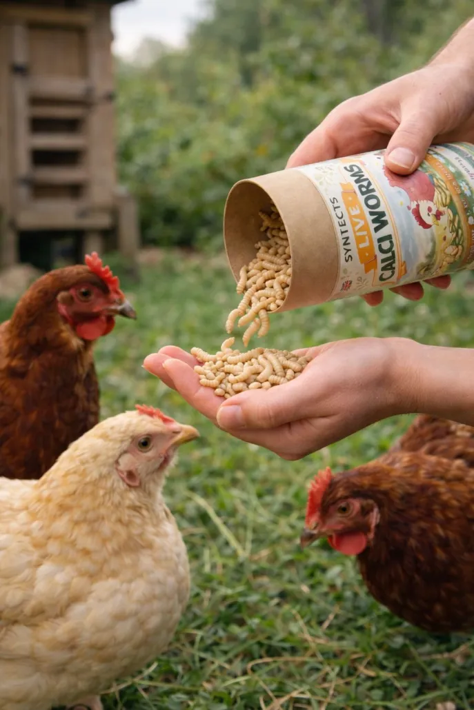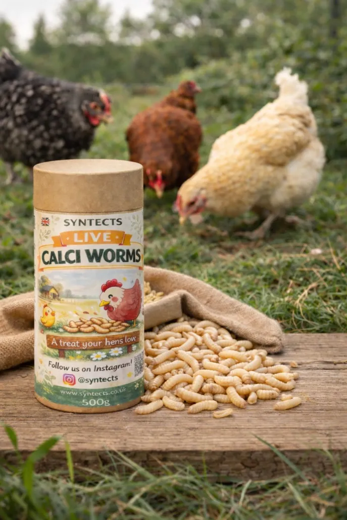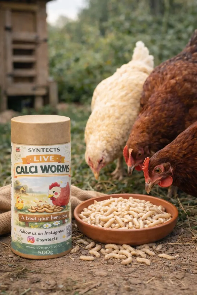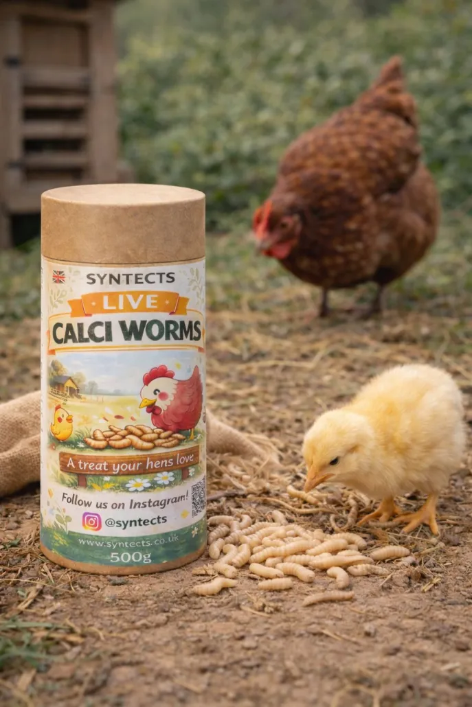 Our Live Calci Worms (live Black Soldier Fly larvae) are a favourite natural treat for UK chicken keepers. This 500g easy-pour tube makes feeding clean, simple, and controlled — pour what you need, reseal, and store the rest.